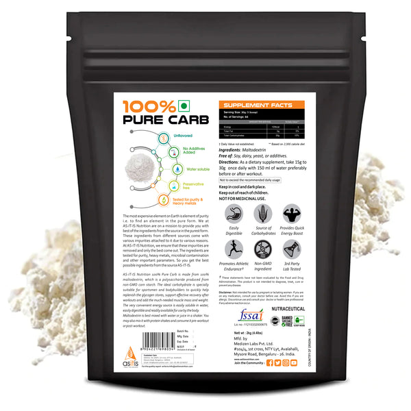 100% PURE CARB/ 3 rd PARTY LAB-TESTED: AS-IT-IS Pure Carb is a dietary supplement made from 100% maltodextrin, which a polysaccharide (number of simple sugars connected together) produced from non-GMO corn. The pure carb is produced from the enzymatic hydrolysis of corn starch followed by purification and spray drying. The resulting white powder is of high purity, free of soy, dairy, yeast, flavour or any other additives and has been 3 rd party lab-tested for assurance on the same. Pure carb is easily digestible, absorbed rapidly as glucose, provides sustained energy levels to help build muscle mass and support weight gain.