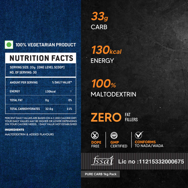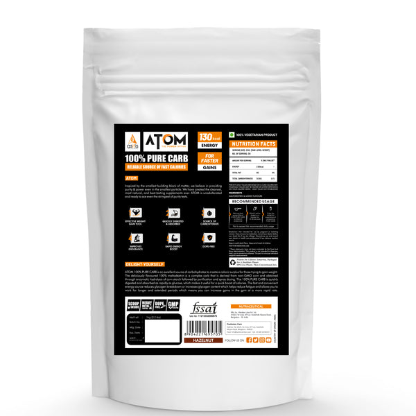 THE 100% CARB: ATOM 100% Carb is maltodextrin derived from non-GMO corn and obtained through enzymatic hydrolysis of corn starch followed by purification and spray drying. The non-GMO supplement is manufactured in a GMP-certified unit, is 3rd party lab-tested, and is free of banned substances and preservatives. The supplement comes in delightful flavours to give you an appealing experience. Compared to glucose, fructose, dextrose, and sucrose, the glycemic index of maltodextrin is higher which means it helps to quickly replenish glycogen stores.