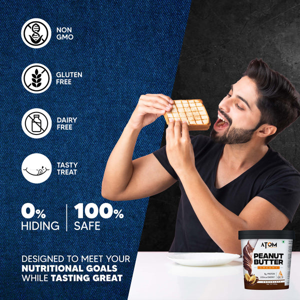 MADE FROM GROUND, ROASTED PEANUTS: ATOM Peanut butter is made from high-quality, fresh, roasted peanuts that are selectively hand-picked. A small serving of peanut butter can give you a calorie-filled, healthy boost of a good amount of protein, fiber, and fats that provide you with the energy required to kick start the day. The ready-to-consume, easy, convenient, caffeine-free, stimulant-free peanut butter makes it an on the go to snack option that can give you the energy boost you require anytime, anywhere.