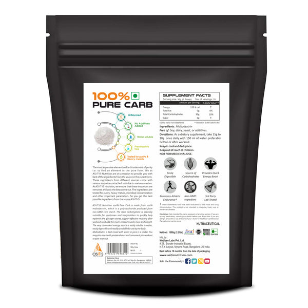 FULFILS HIGH-CALORIE REQUIREMENT: To gain weight or body mass, your calorie intake should be more than what you burn. Managing 6 meals a day to meet the high-calorie needs may not be a feasible option for most of us. If you are someone who leads a busy lifestyle and can eat only as many calories as you burn, the chances of you gaining weight may get ruled out. AS-IT-IS Mass gainer supplement provides you with quantified carbs and protein in an easy to make, convenient and quick shake. 2 serving of AS-IT-IS pure carb and 1 serving of Whey Protein provides you with 359 calories, 24g protein, 62.5g carb, 5.4g BCAA. Consuming mass gainer with milk 30 minutes post-workout helps you to meet the high-calorie requirement to get the desired weight gain results.