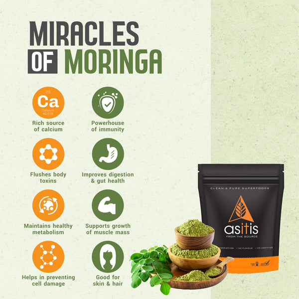 NATURAL INGREDIENT FOR HEALTHY SKIN: Organic Moringa leaf powder contains the potent vitamins and minerals that benefit skin health naturally. When applied topically on the skin as a face pack, moringa encourages skin cells to renew themselves, promote collagen synthesis, helps reduce blemishes, pigmentation, wrinkles and fine lines. Its antioxidant and anti-inflammatory properties protect the skin cells from oxidative damage and promote clearer and nourished skin.