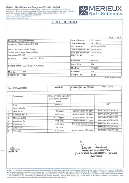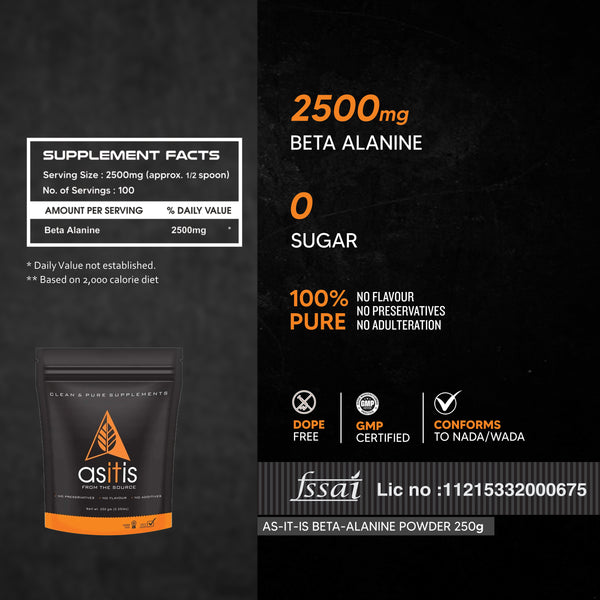 UNFLAVOURED & UNADULTERATED: With zero sugars, flavours, fillers, or additives, AS-IT-IS Beta Alanine is a pure, reliable, and safe supplement. The supplement is made in a GMP-compliant facility, and every batch of the product undergoes 3rd party lab-testing to verify purity and authenticity.