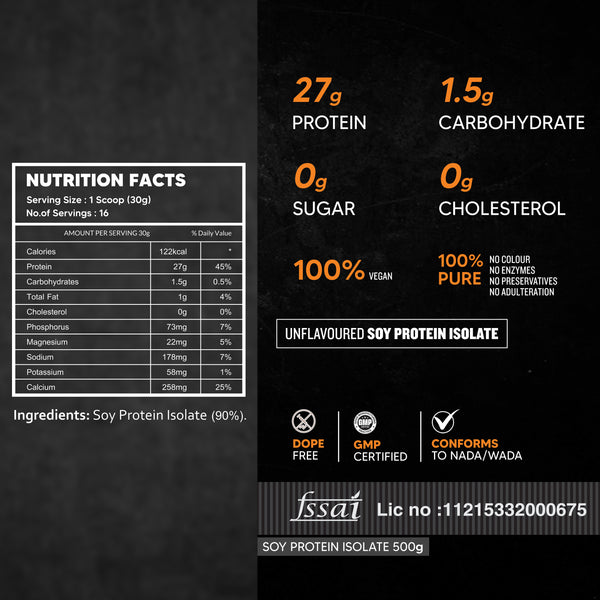 SUITABLE AS A MEAL SUPPLEMENT: The Soy Protein Isolate is designed to suit meal supplementation. The unflavoured, unsweetened protein supplement has smooth texture which makes it suitable to be added to roti atta, idli/dosa batter, or oatmeal to enhance the protein content of your daily meals.