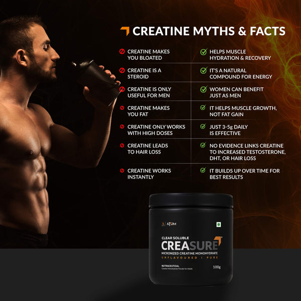 100% WATER-SOLUBLE, MICRONIZED: Forget gritty texture and bloating. Unlike regular Creatine, ATOM Creasure® is 100% water-soluble, and micronized for lightning-fast absorption. Zero clumps, zero hassle – just quick absorption and clean power for max gains. Manufactured in a GMP-compliant facility and 3rd party lab-tested for purity and safety.