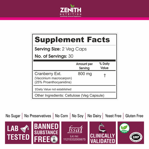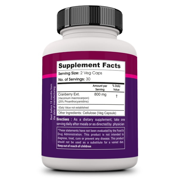 HIGH STRENGTH EXTRACT: Cranberries are widely known to contain one of the highest concentrations of antioxidants. The vegetarian capsules provide 400mg of Cranberry extract with 25% proanthocyanidin per serving. The easy to swallow capsules do not contain artificial colours, lactose, fish, gluten, sugar, salt, and flavour. We make sure our supplements go through rigorous lab-testing for purity, quality and potency.