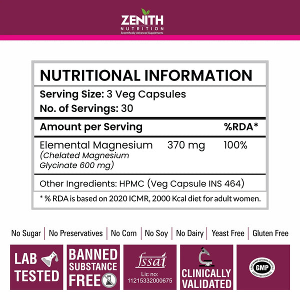 SUPERIOR CHELATED FORM - Zenith Nutrition Magnesium glycinate is the safe, gentle and effective form of magnesium bonded with glycine for superior absorption and digestive tolerance. Magnesium has an active role in hundreds of cellular functions including energy metabolism, glucose balance, nerve and muscle function. Manufactured at a GMP-certified facility and is free of gluten, soy, dairy, corn, sugars, yeast and preservatives.