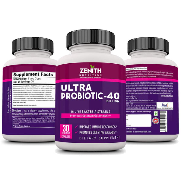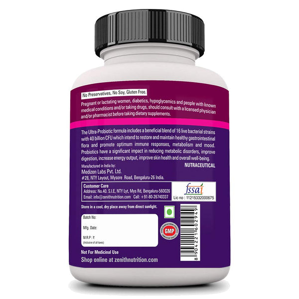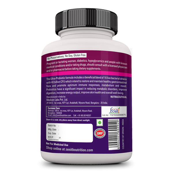 GUARANTEED POTENCY: Zenith ultra-probiotic is the ultimate broad-spectrum supplement formulated with high potency selectively chosen probiotic blend for advanced digestive and immune support. Probiotics are live micro-organisms that exert a prophylactic effect by improving microbial balance. The vegetarian supplement is easy to swallow, free of gluten, fish, flavour, sugar, salt, or any other form of excipient. It has gone through strict quality control to validate its potency.