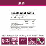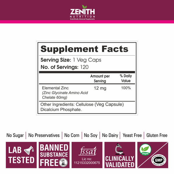 Zenith Nutrition High Absorption Chelated Zinc Glycinate 60mg - 120 Veg capsules | Boosts Immunity | For General Wellbeing