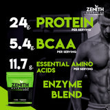 HIGH PROTEIN YIELD: Every scoop delivers 24g of protein, enriched with 5.4g of BCAA and 11.7g of essential amino acids to enhance strength and muscle mass. Zenith Raw Whey is cold-processed and nutritionally superior, contains no fillers, artificial flavours, sweeteners, gluten and is free of added preservatives and banned substances.